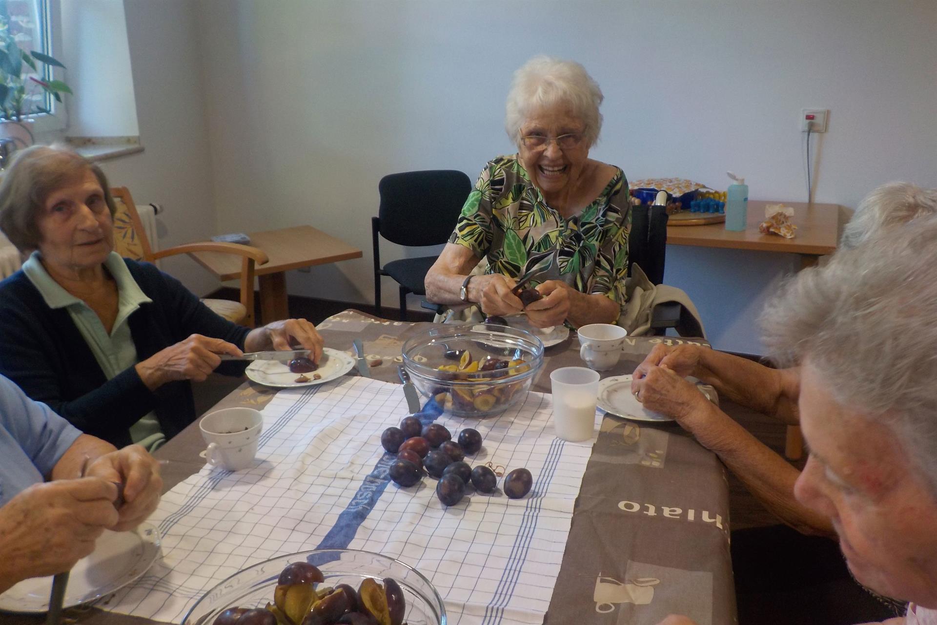 Beim heutigen Herbstfest konnten sich die Bewohner:innen sowie Angehörige und Mitarbeiter:innen nachmittags über Pflaumenkuchen und abends über Pommes freuen. Einige unserer Bewohner:innen haben tatkräftig bei der Zubereitung des Essens geholfen. Bei Musik wurde mitgesungen, aber auch getanzt.